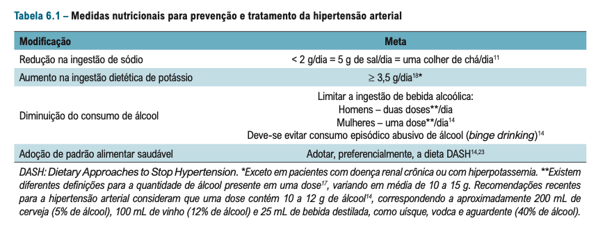 - Limitar a ingestão de bebidas alcóolicas em até duas doses/dia para homens e uma dose/dia para mulheres. Evidências recentes indicam que não há relação entre consumo de álcool baixo a moderado com efeitos cardioprotetores. A hipótese é que tal associação se deu devido fatores de confusão (5). A ingestão de álcool, mesmo em baixas doses, pode trazer prejuízos à saúde, com maior risco no caso de consumo elevado, seja contínuo ou episódico (6). Indivíduos que consomem mais de seis doses/dia, quando reduzem essa ingestão em cerca de 50%, obtém uma diminuição de 5,5 e 4,0 mmHg na PAS e PAD, respectivamente (7).