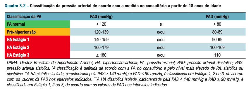 - A classificação “PA ótima” foi removida, agora valores de pressão arterial sistólica (PAS) abaixo de 120 mmHg e pressão arterial diastólica (PAD) abaixo de 80 mmHg segue como “PA normal”;