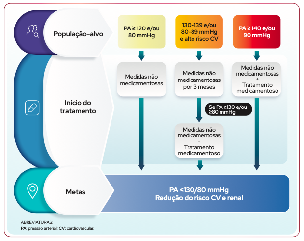 - Tratamento não medicamentoso: a adoção dessas medidas tem o objetivo de reduzir o risco cardiovascular, é indicada para todos os indivíduos com PA ≥ 120/80 mmHg. São elas: cessação do tabagismo, perda de peso (IMC < 25 kg/ m2; circunferência abdominal < 102 cm em homens e < 88 cm em mulheres), modificações na ingestão alimentar, prática de atividade física e exercício físico, cuidado com aspectos psicoemocionais.