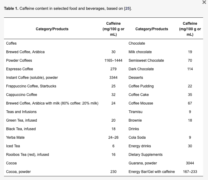 É importante também avaliar o teor de cafeína presente em cada alimento ou bebida consumida, uma vez que as concentrações variam conforme tipo de preparo, volume e marca. O artigo em questão apresentou em anexo a tabela abaixo.